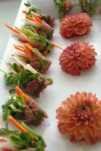 Seared Filet of Beef Roll Ups – Crunchy Organic Vegetables & Microgreens Rolled in Seared Filet of Beef, Horseradish Cream (dozen)